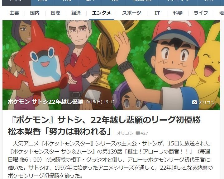 Berita tentang Ash menjadi juara telah menjadi begitu heboh sehingga menjadi berita tren nomor 8 di Yahoo Jepang, yang telah mengejutkan semua orang. Berita lainnya yang sedang tren di atas Ash memenangkan liga tidak ada hubungannya dengan anime atau video game dan merupakan berita dunia nyata yang cukup serius pula.